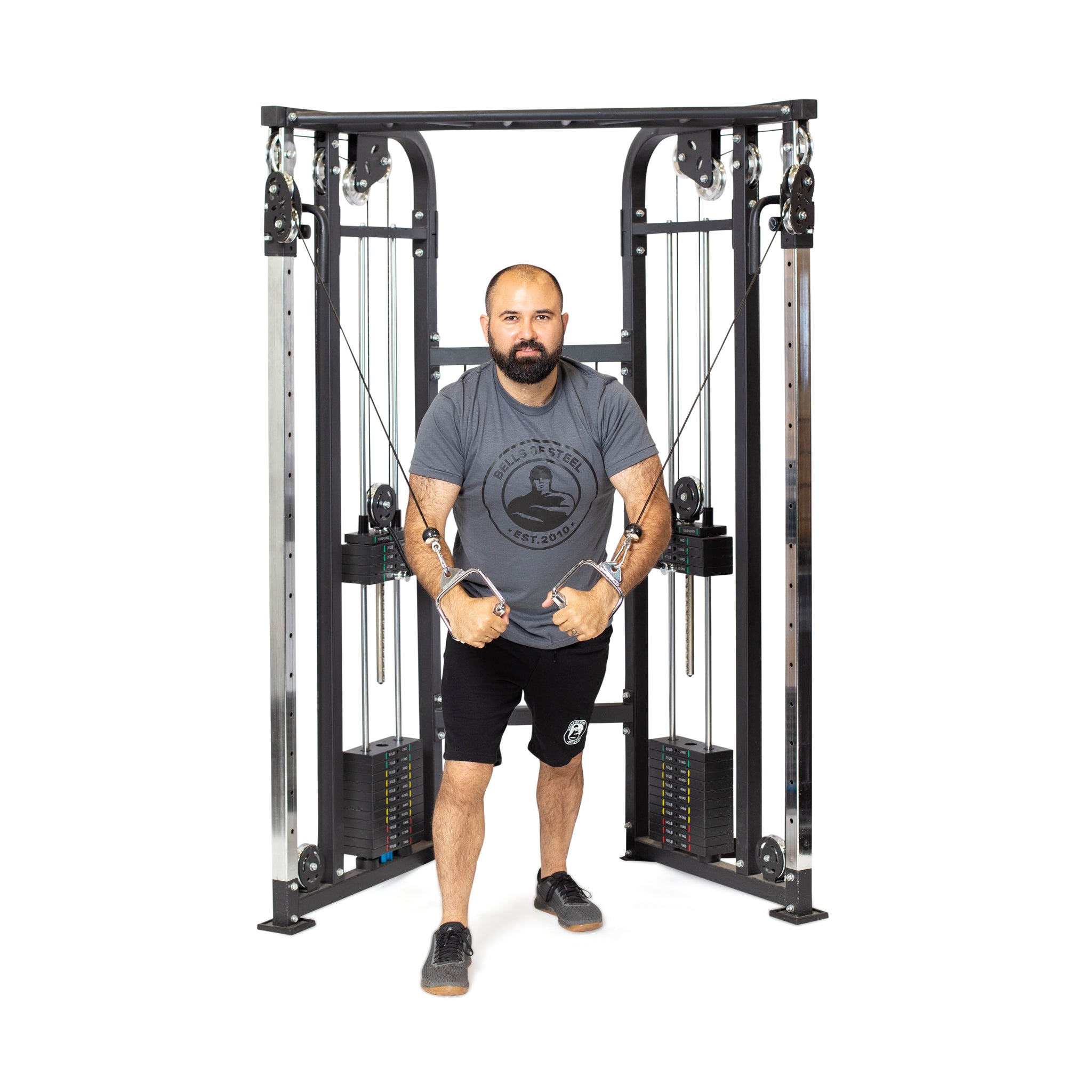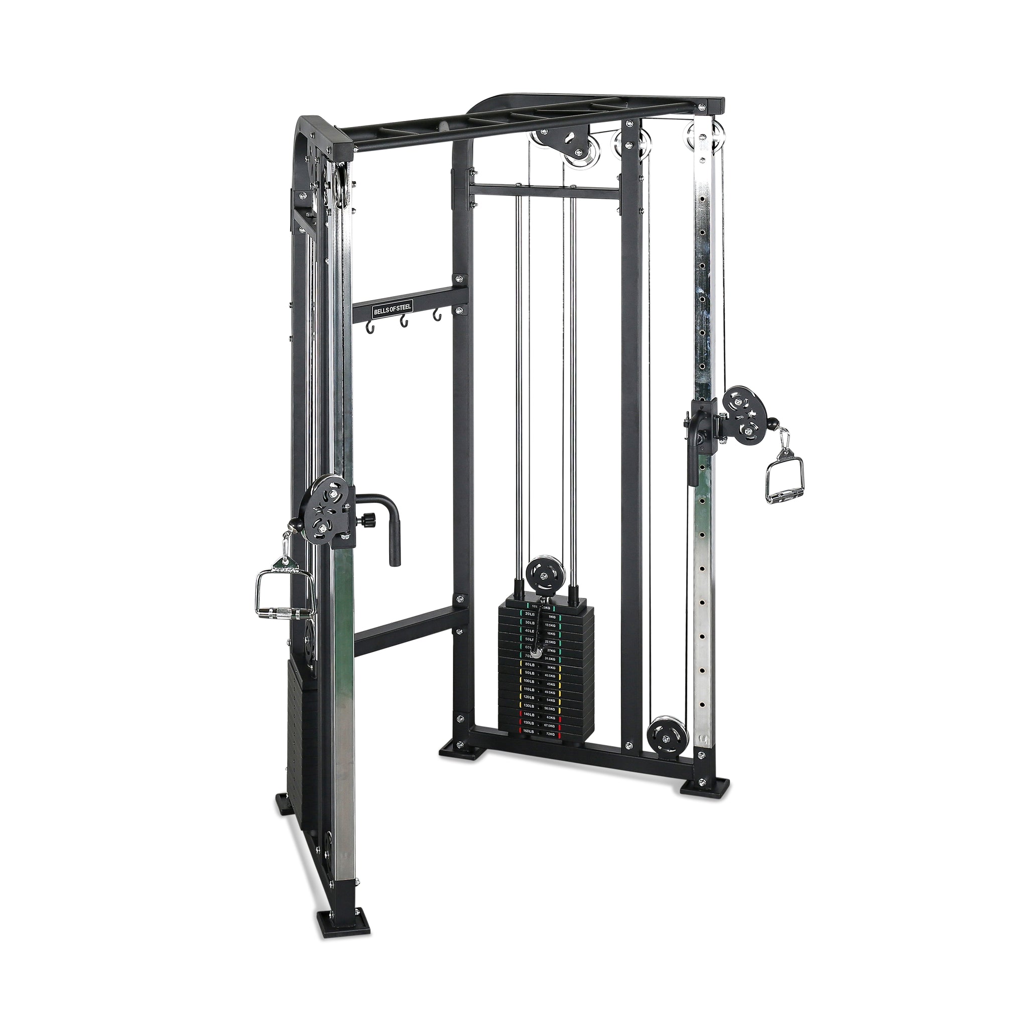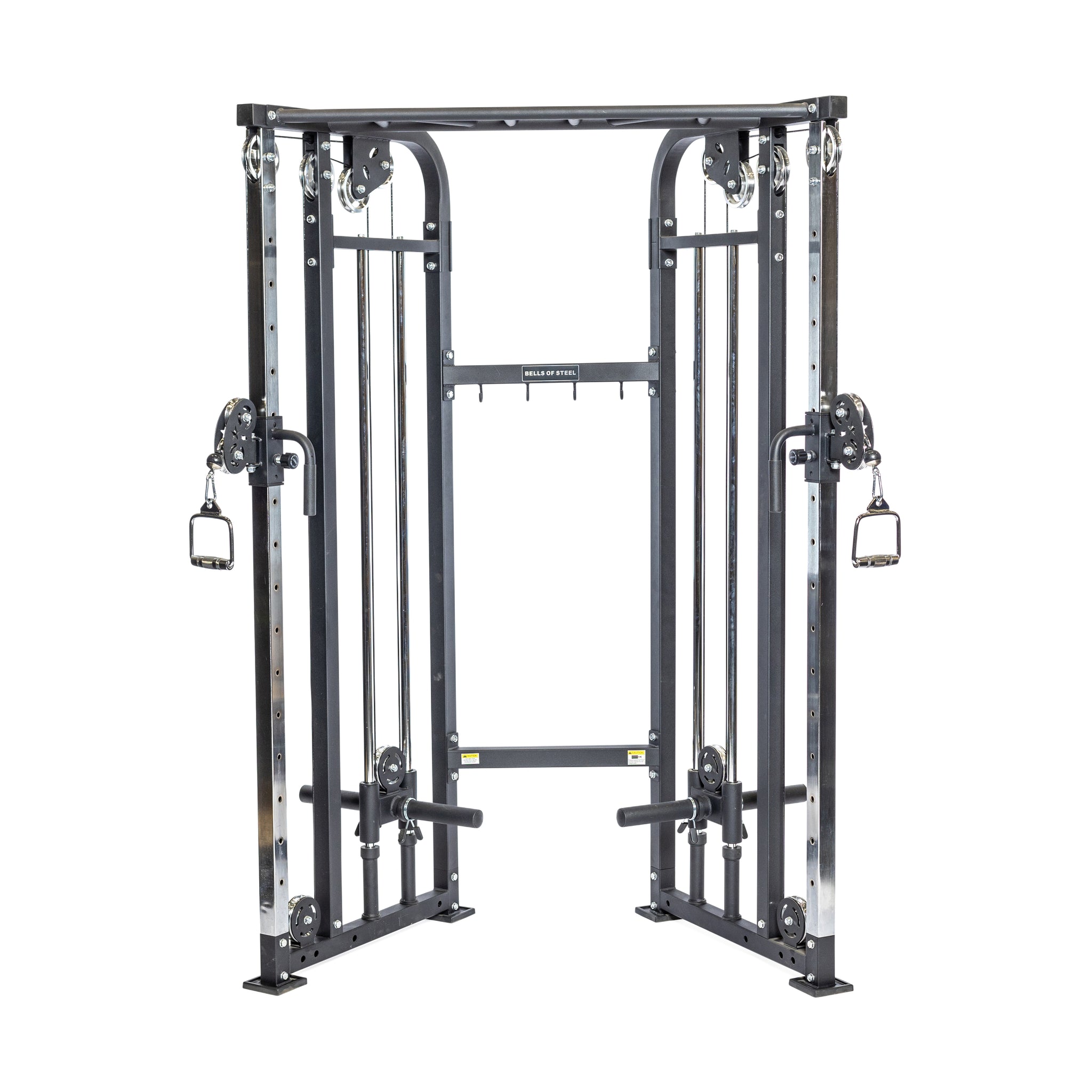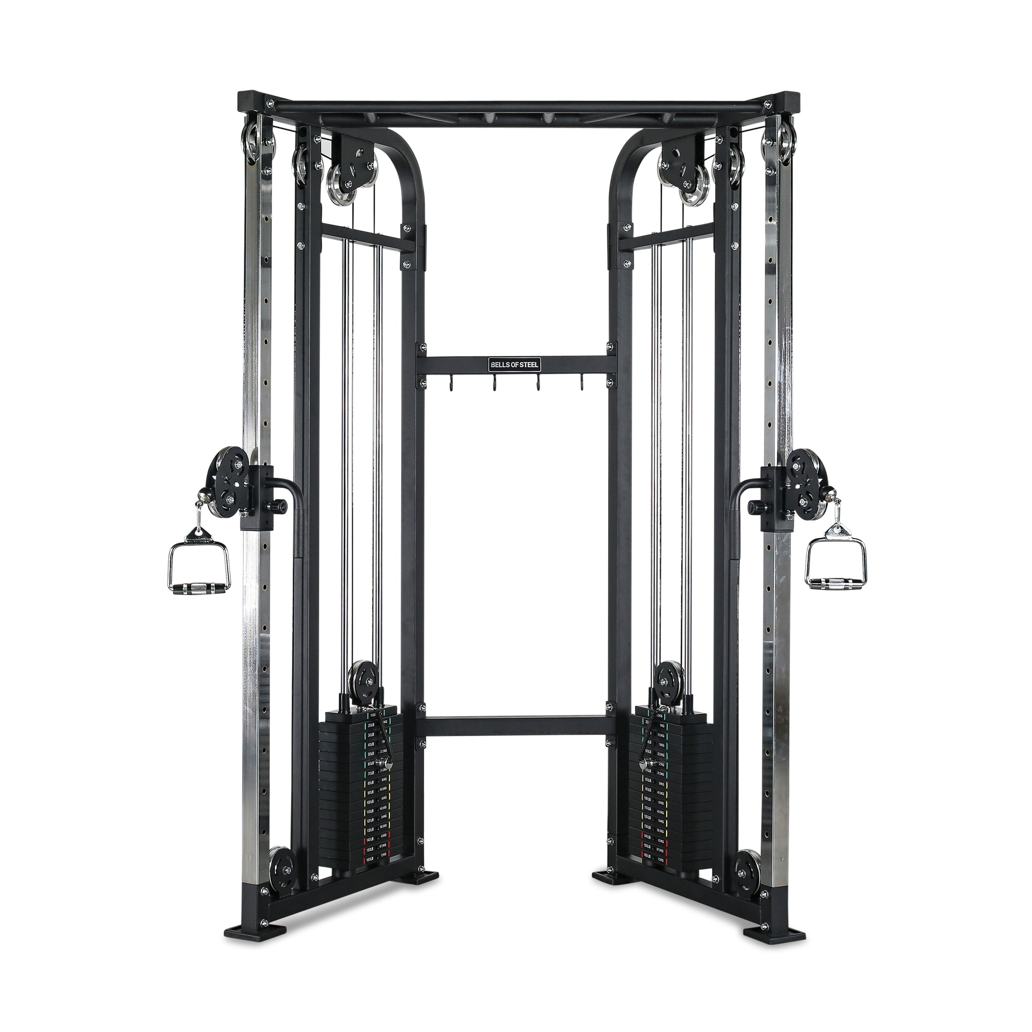 The Bells of Steel Functional Trainer is a dual cable crossover functional trainer with adjustable pulleys, weight stacks, two handles for versatile exercises, a sturdy metal frame, and multiple height settings.
