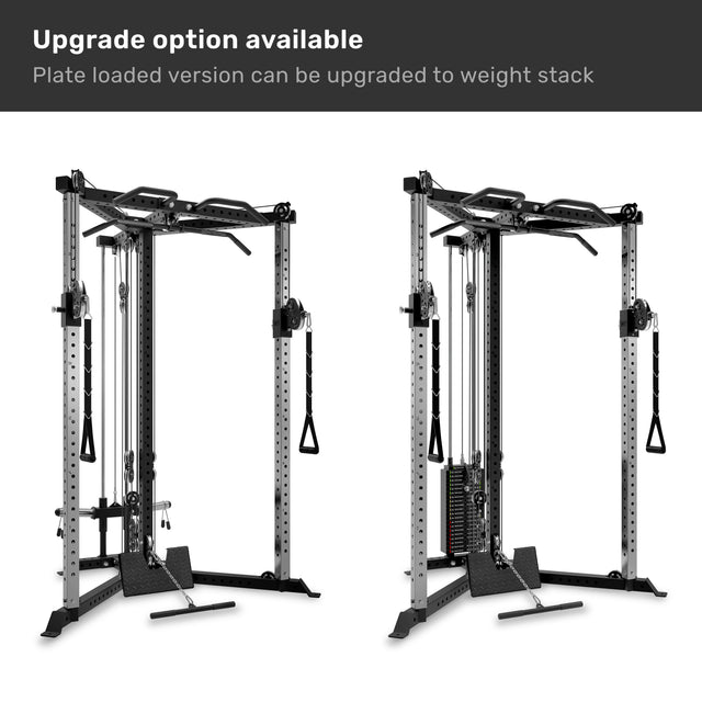 - Upgrade from plate-loaded to a 210 lb stack at any time