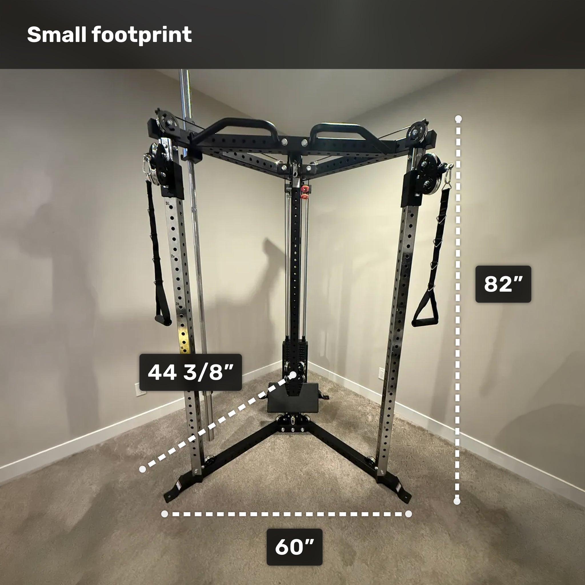 Corner-fit design optimizes garages, basements, and small-room gyms.