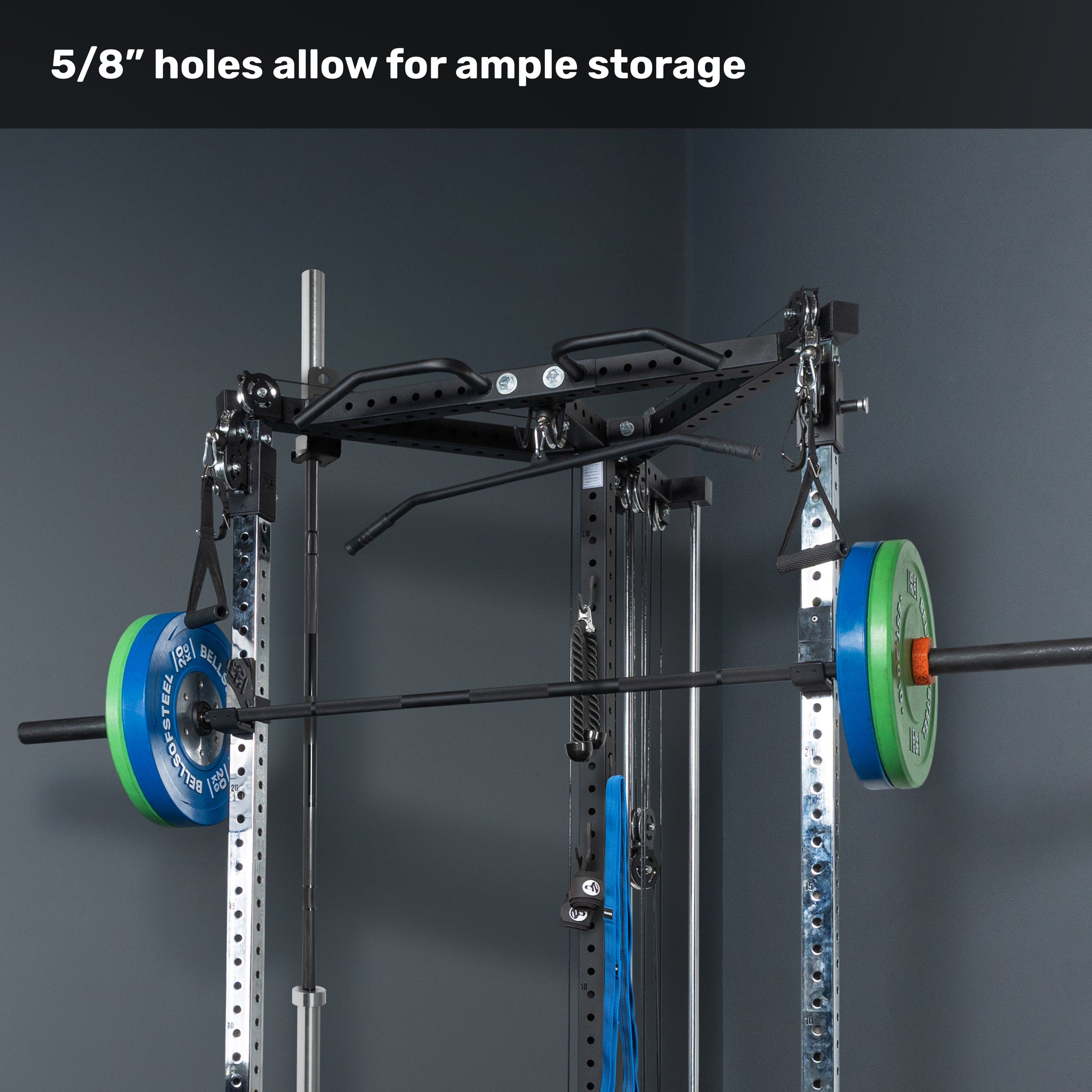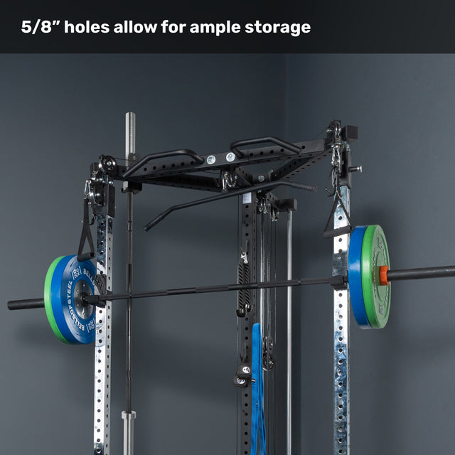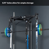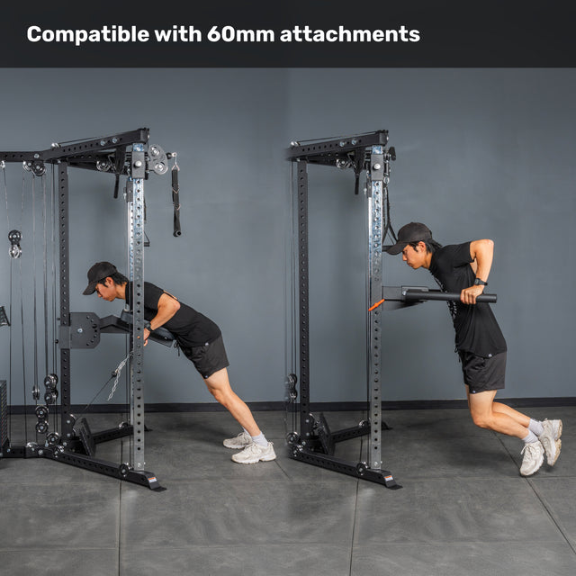 The 2.3”×2.3” uprights with 5/8” holes work with J-cups, spotter arms, dip attachments and more—letting you squat, bench, and everything in between without buying a separate rack and cluttering up your gym.