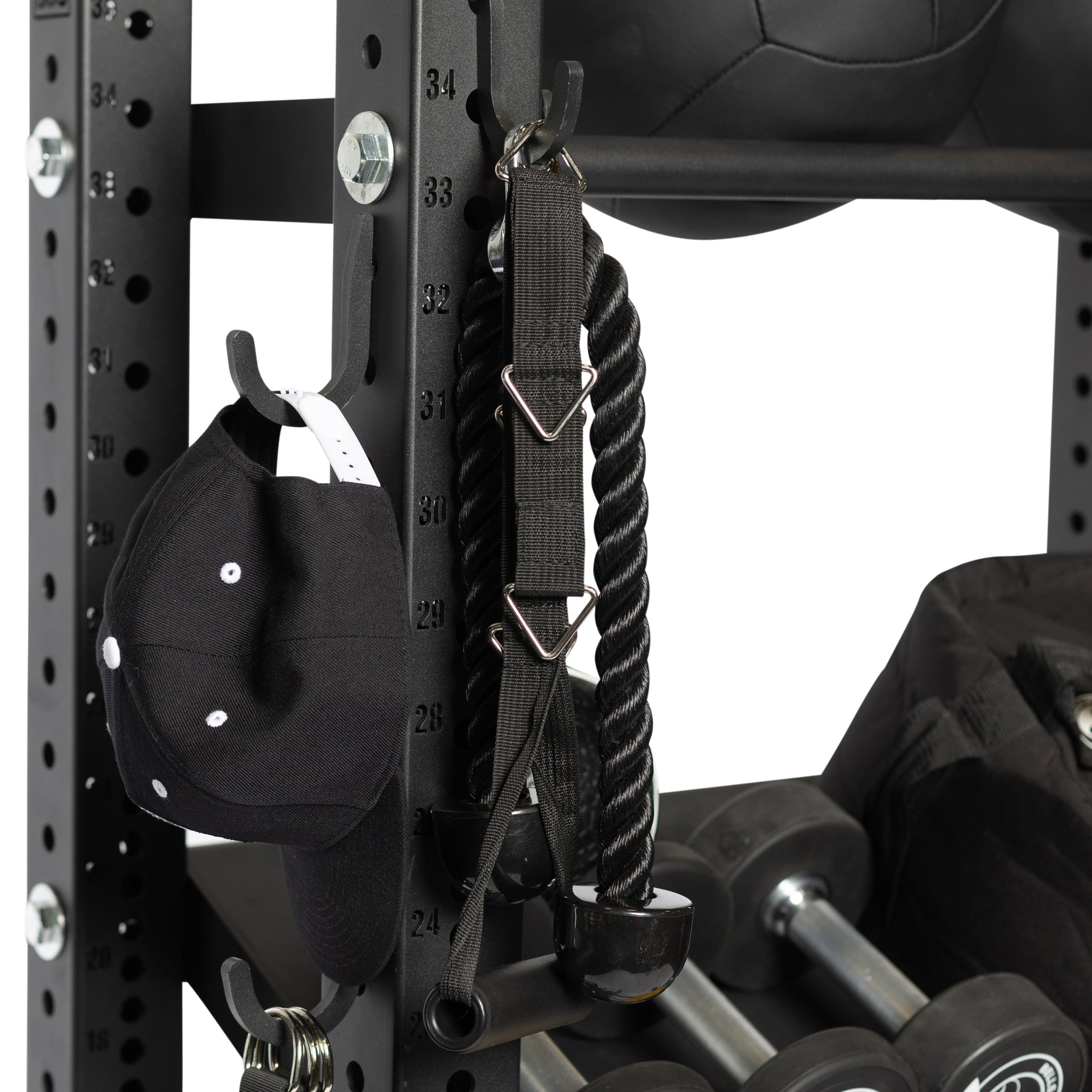 With Utility Hooks, you don't have to buy a pegboard—your gym equipment IS the pegboard. The upper crossmembers of your power rack. The rear uprights of your cable tower & lat pulldown. Heck, even the sides of your spotter arms! Unleash your inner architect with its size & simplicity.