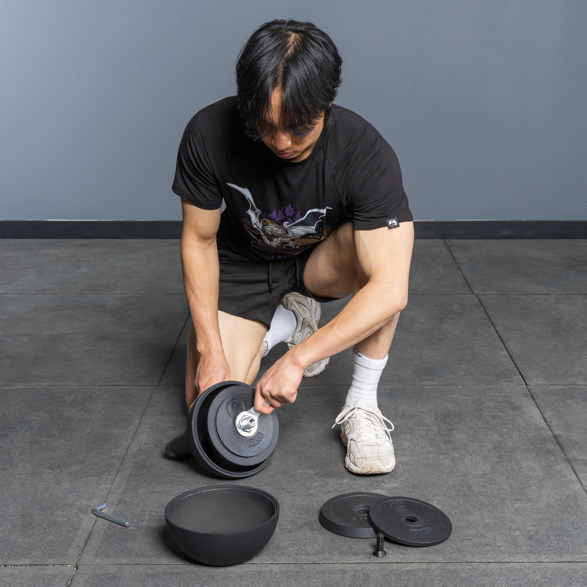 IMPORTANT: The Adjustable Kettlebell is a fantastic tool, but it is not recommended when a fast transition of sizes is needed since changing the weights takes 1-2 minutes. If you need two different weights for swings and overhead work, we recommend getting two adjustable kettlebells for sale — you save 10% when you buy a pair.