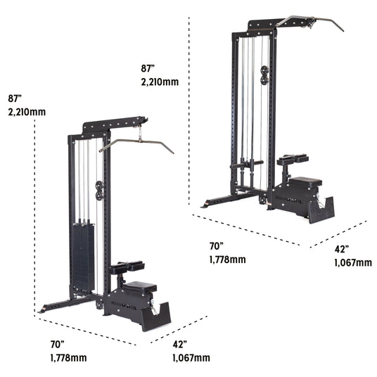 • Saves 15+ square feet vs separate units → This replaces a standalone lat pulldown and a seated row machine, giving you a full cable back workout in roughly the same space as a single power rack.